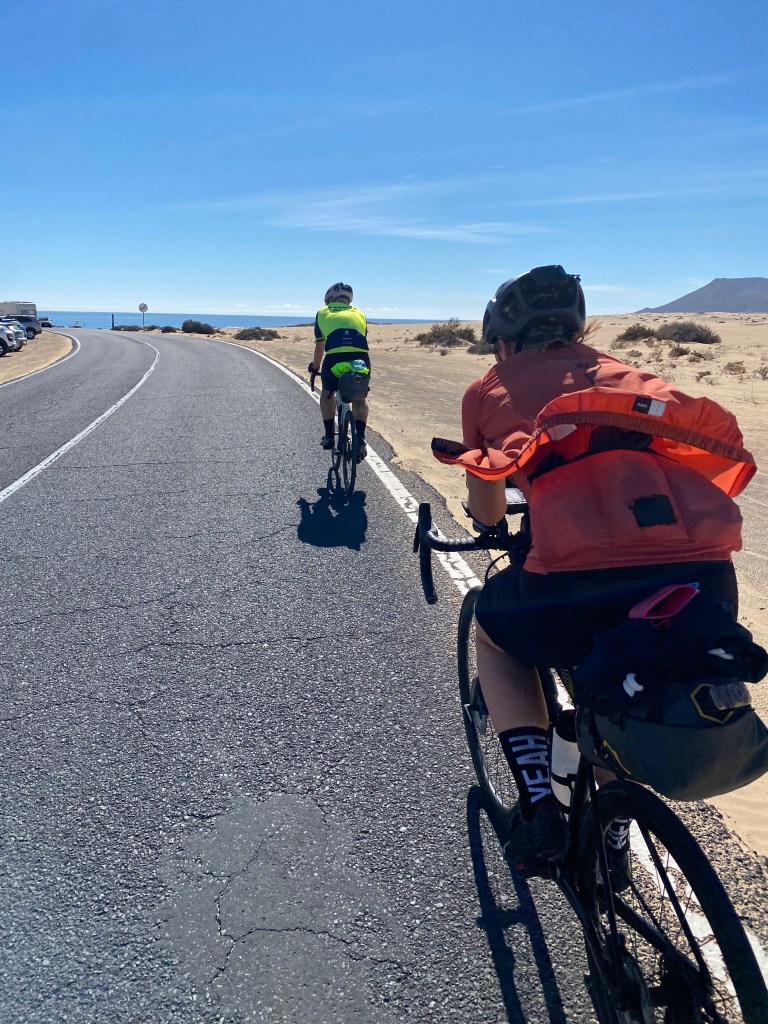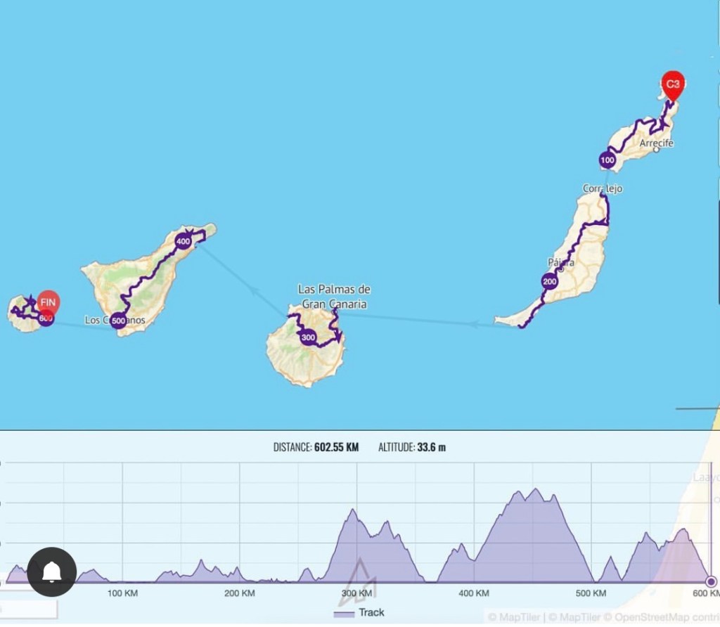 Starten går på Lanzarote. Det är relativt lätt cykling hela vägen. Gör max 2 minuter stopp. En gång för att knäppa vindvästen och en gång för att lägga upp kedjan som åkte av. Kommer till hamnen i tid, men tyvärr är båten fullbokad och det är bara att vänta på nästa. På båten träffar jag Sara från Tyskland och Andrei från Rumäninen. När vi tjejer tar en cola och käkar en macka tar Andrei en bärs! När cykligen börjar på Fuerteventura håller vi ihop några mil. Det är ett osupportat race, men det är okej att drafta. Det är söndagsstängt vilket gör att jag till slut går utan vatten. Planen var att komma med sista färjan till Gran Canaria men hinner inte utan får leta upp ett hotell och ta första morgonfärjan istället.